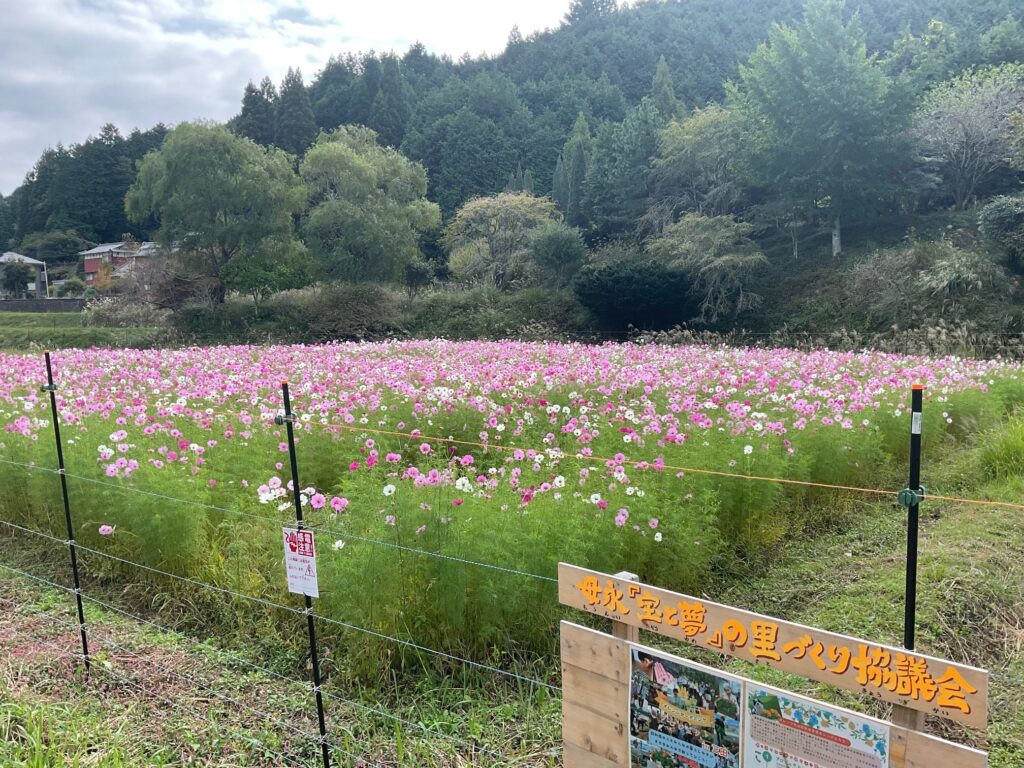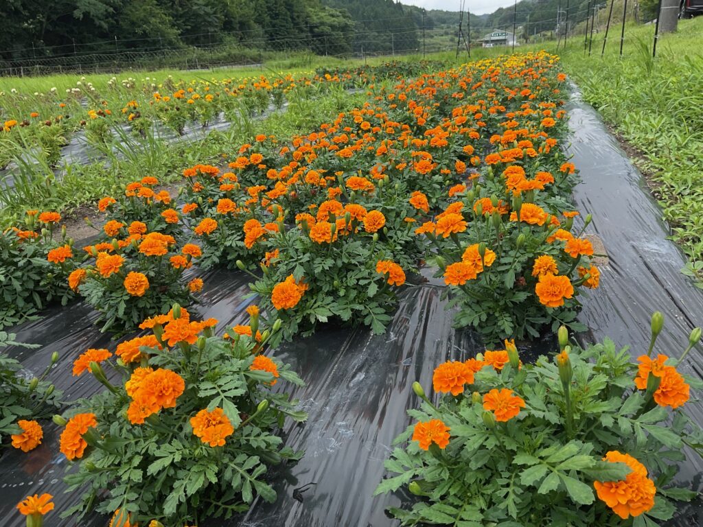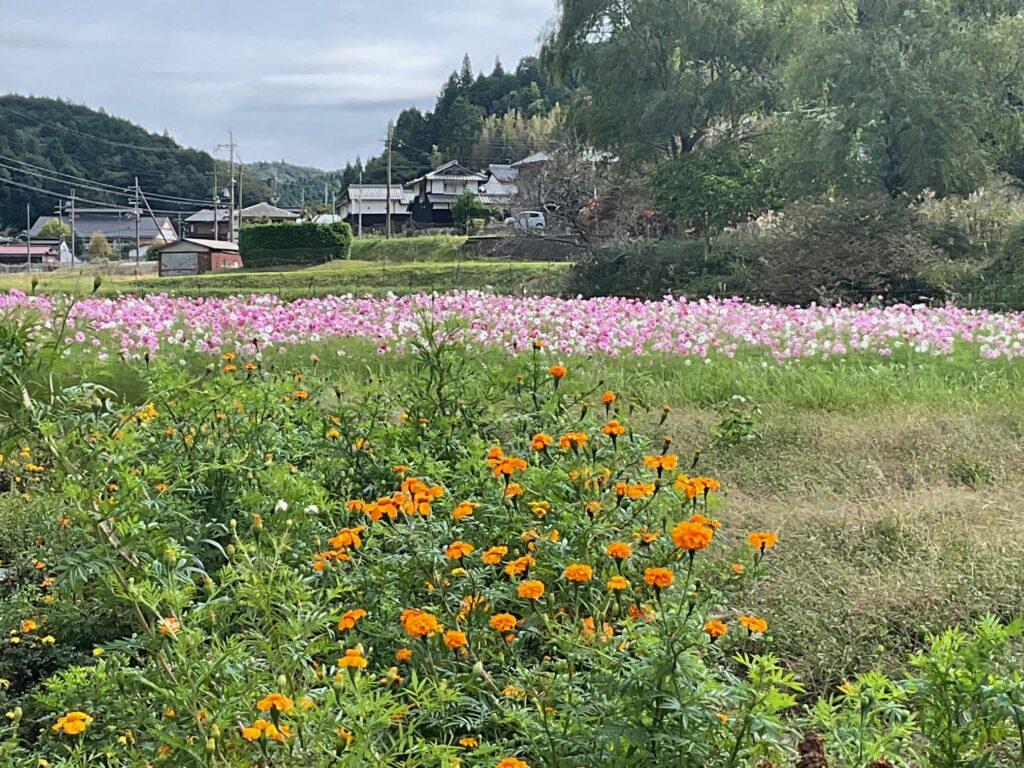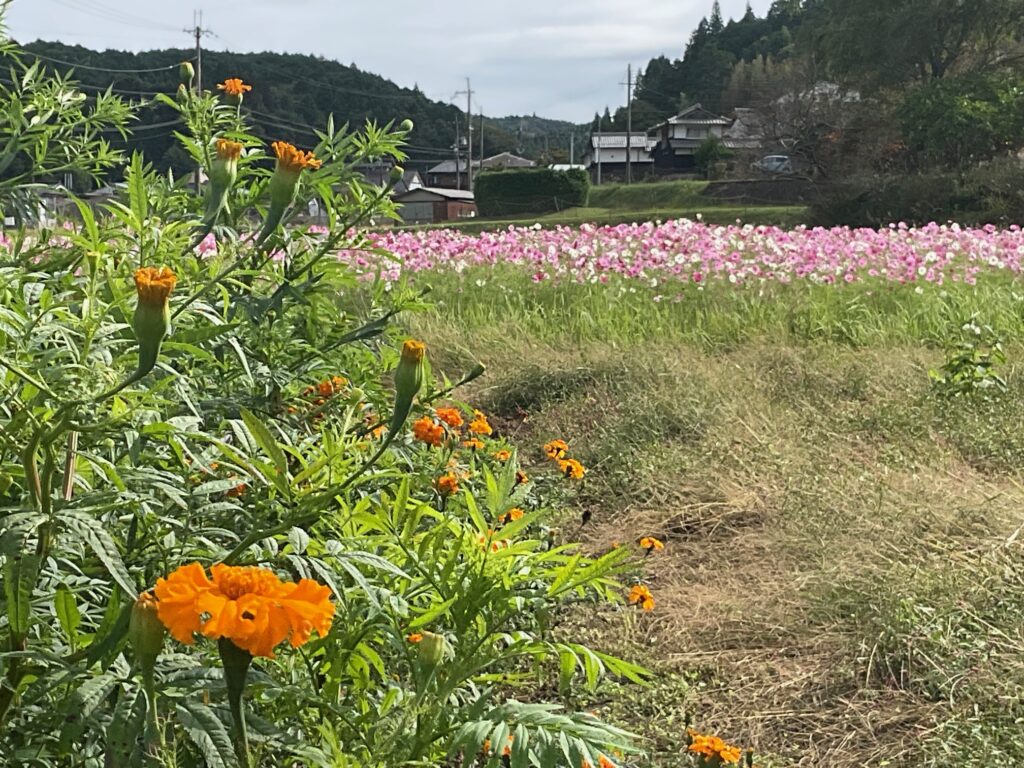 令和7年度の新事業として、県道沿いの休耕田を里づくり協議会がお借りし、花を育てることとなりました。試行錯誤しながらですが、夏から秋にかけてのマリーゴールドの花を、秋にはコスモスの花を咲かせました。