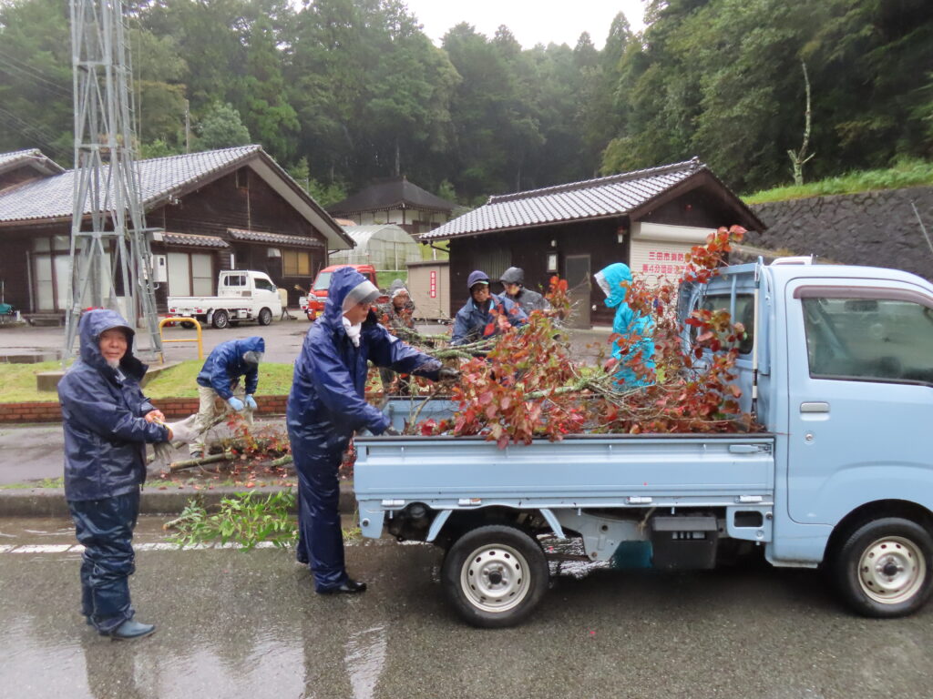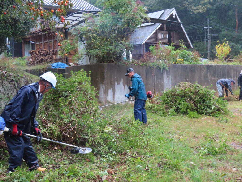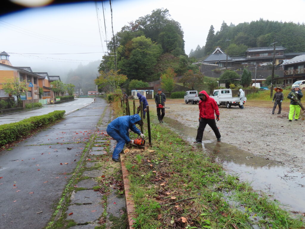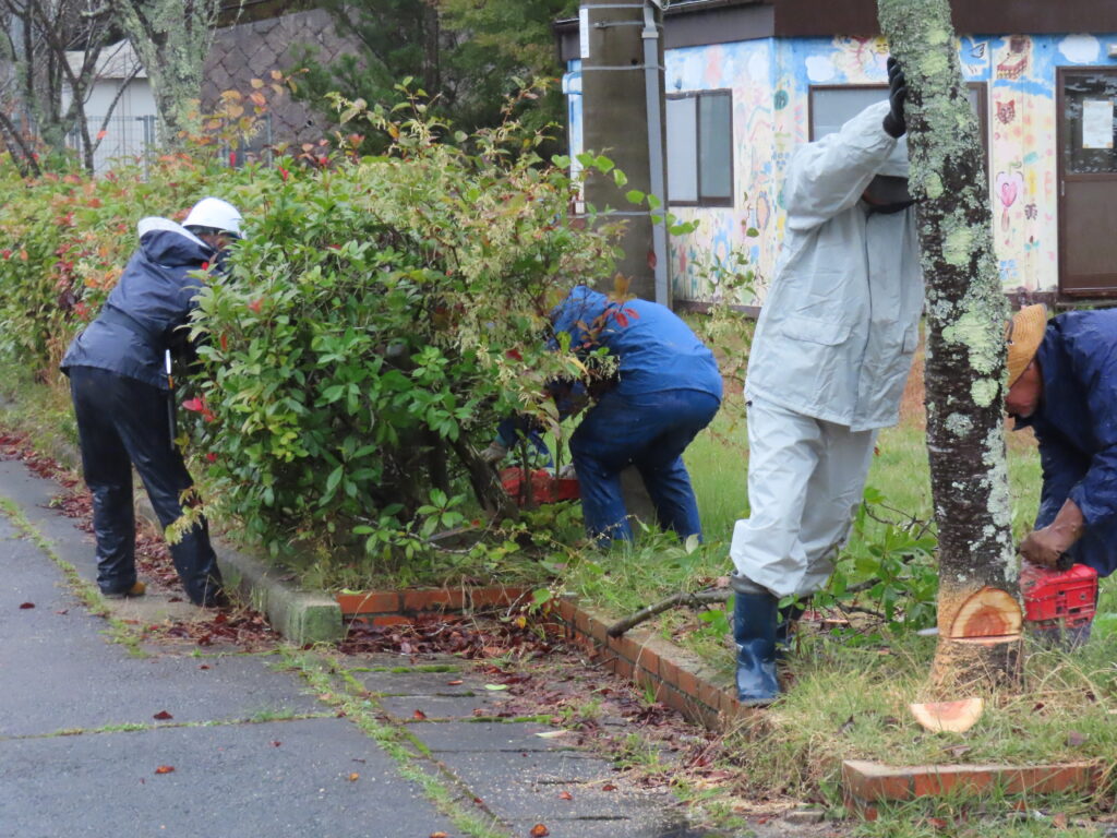 雨の中、小学校前ならびに山の峰会館の植栽帯を整備しました。